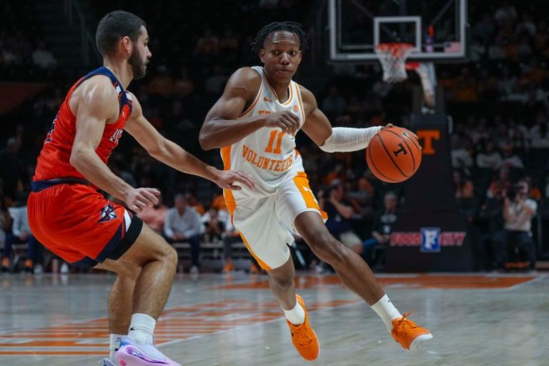Tennessee takes over the top spot, largely by getting through the week unscathed. The Volunteers received 26 of 31 first-place votes cast this week and hold the top spot for the first time since Feb. 11, 2019. Tennessee replaces Kansas, which held the top spot since the preseason poll before tumbling to No. 10 this week after defeats to Creighton and Missouri.