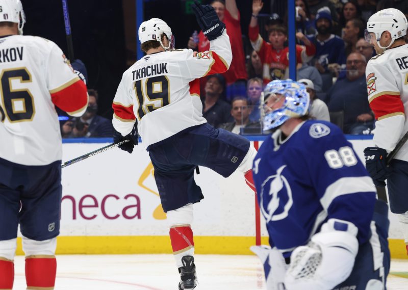 Sidelined in the season’s final 25 games with a lower-body injury, Tkachuk tallied on two power plays in Game 1 of the Battle of Florida. Defenseman Nate Schmidt added one on the man advantage and another at even strength as Florida went 3-for-3 on the power play.