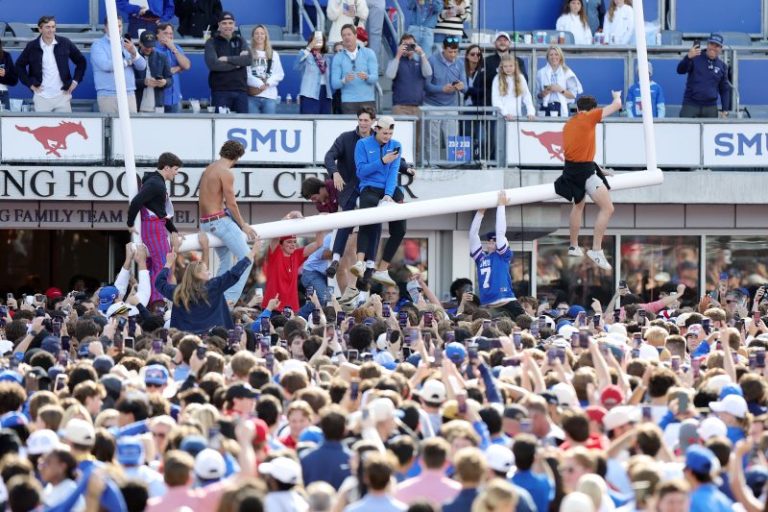 The celebration of the Mustangs’ first top-10 win in 42 years didn’t take long to commence, as fans immediately stormed the field at Gerald J. Ford Stadium in Dallas. Fan then broke one of the goalposts on the field and took it on a joy ride out of the stadium.